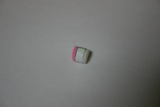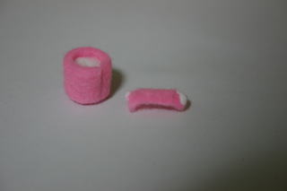 | 2.上下に白とピンクの丸いフェルトを貼る 貼ってから余分な部分をカットしてもOKです 3.本体に幅1cm×適当な長さのフェルトを貼る 重なった部分をカットする |