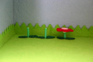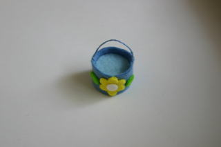 | 4.本体に幅2cm×適当な長さのフェルトを貼り 重なった部分をカットする 5.刺繍糸でバケツの持ち手を作る 糸の端にボンドを付けこよりを作るようにしてとめる 反対側も同じように! |