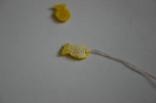 | 1.カラーワイヤーを6.5cmにカットする 2.先端にボンドを付け刺繍糸を3回巻く (見本の糸は3本どり) 3.適当な長さで糸をカットする |